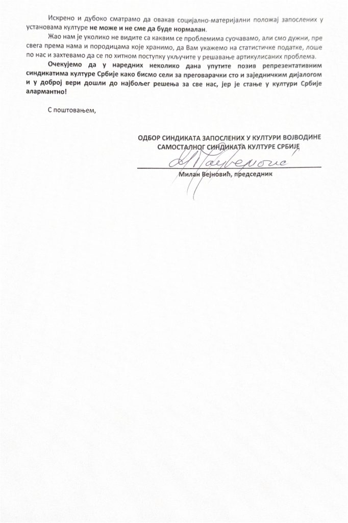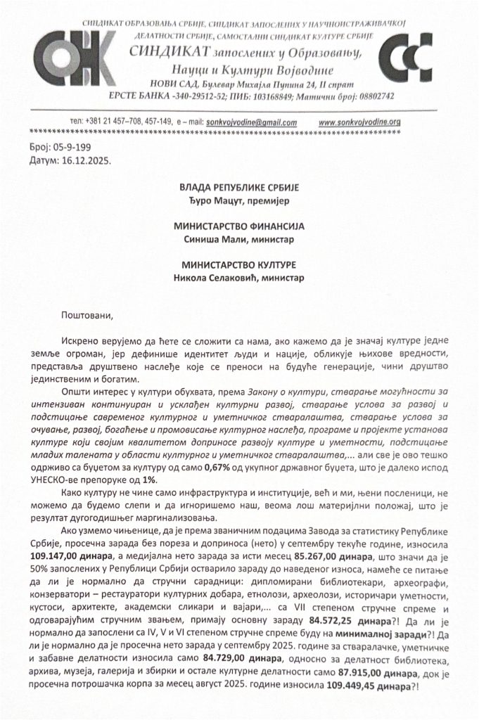 Влади и Министрима од Синдиката Културе Војводине Posted on 19 децембра, 2025 by mbanja19 децембра, 2025 16.12.25.